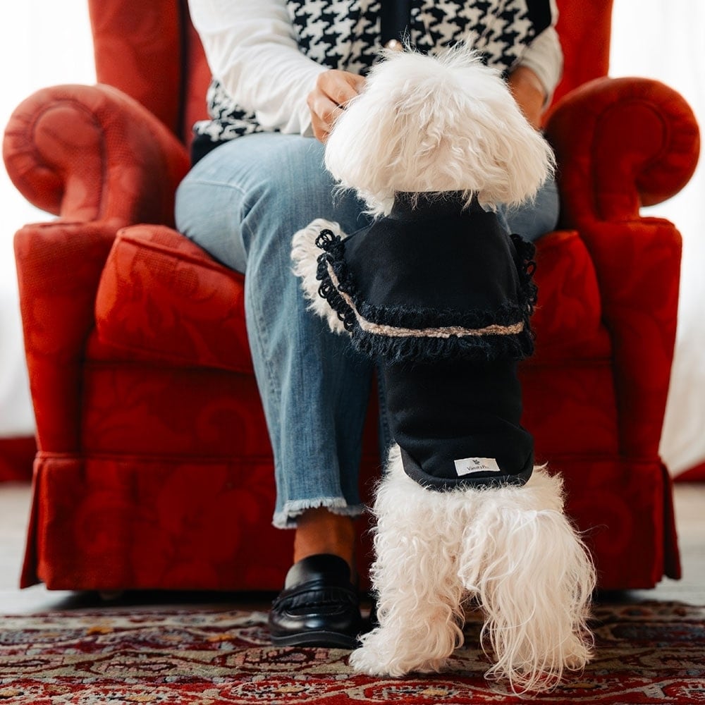ケープの端のループ上に編み込まれたニットがデザイン性の高い1着です。