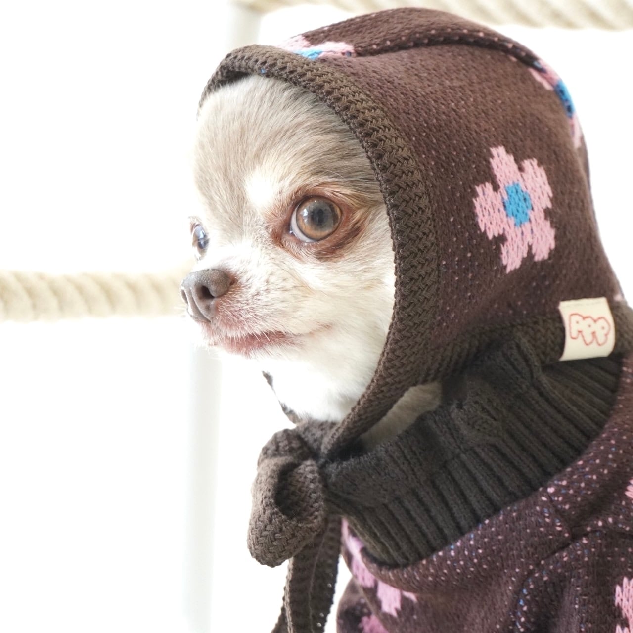 花柄の編み込まれたニットとバラクラバのセットのニット。