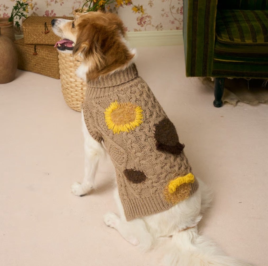 ケーブル網みにひまわりのような模様のデザインが特徴的なニット。