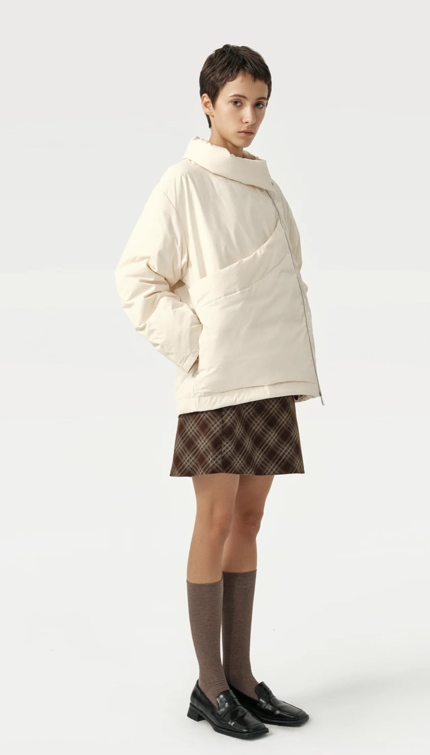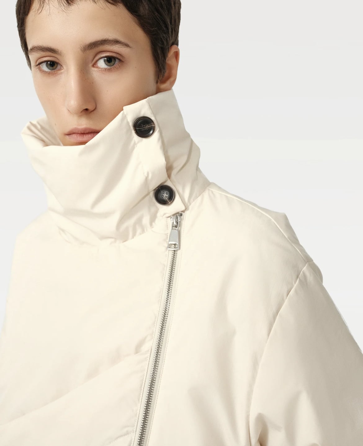 斜めに配置されたジップや、立ち襟の使用でモードなお印象でご着用いただけます。