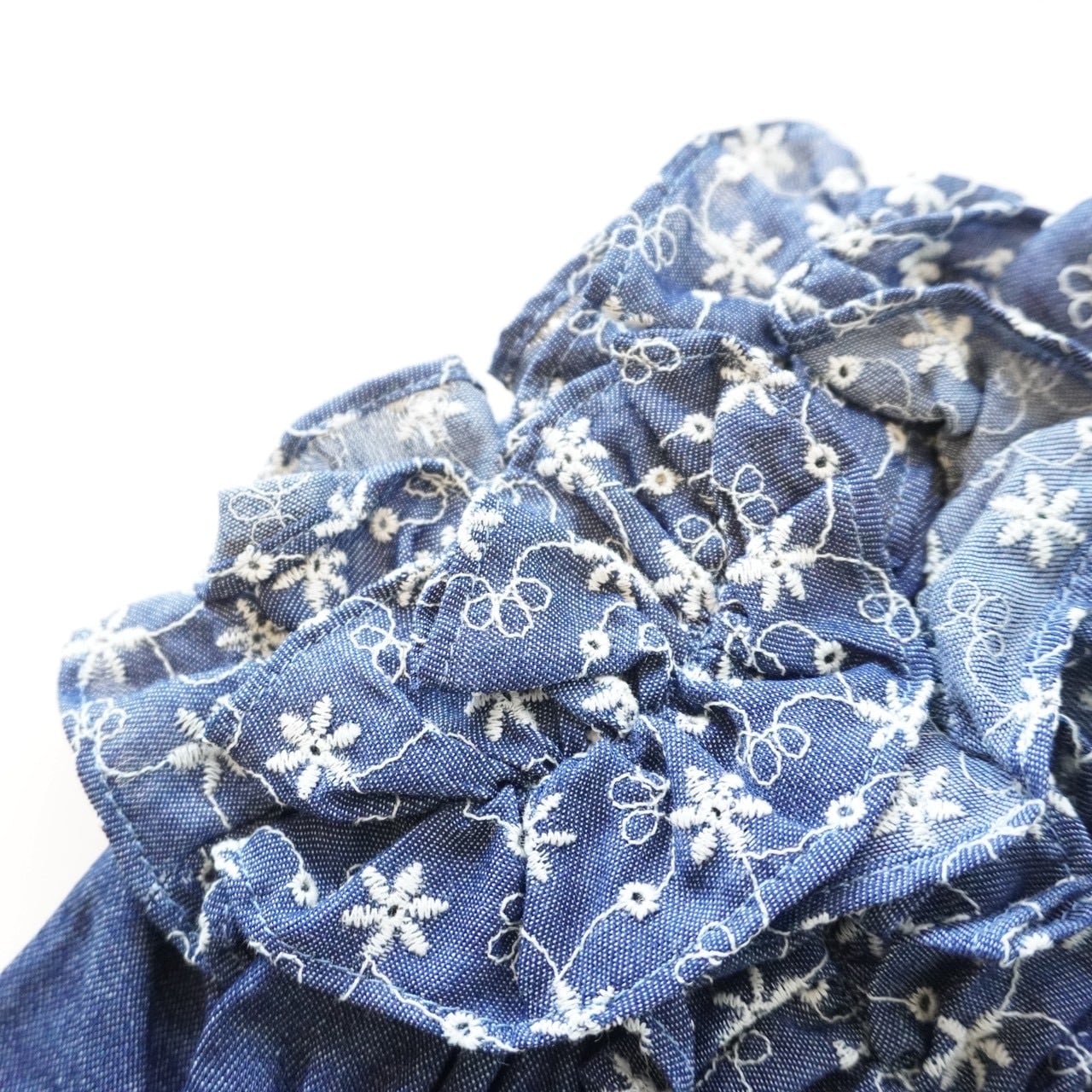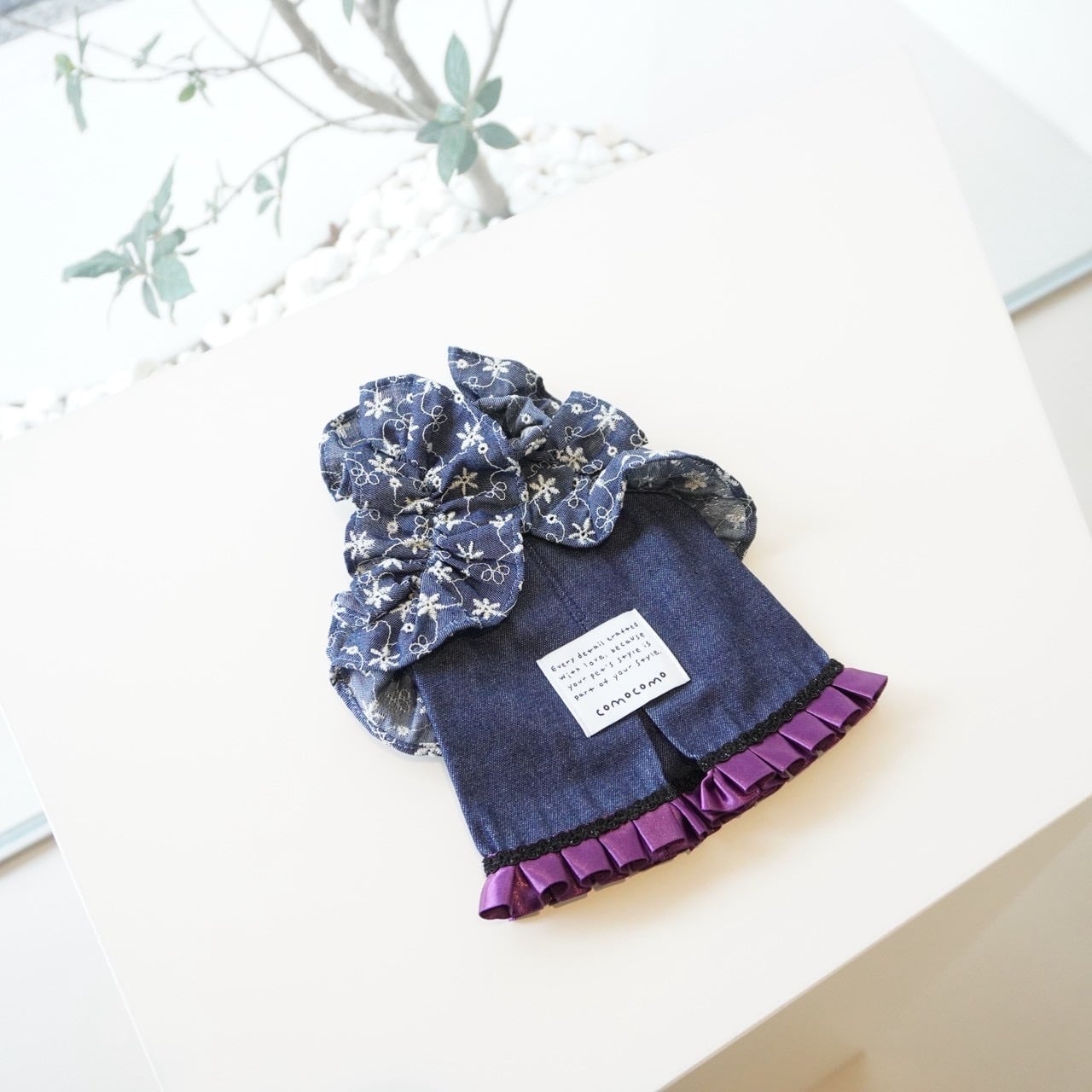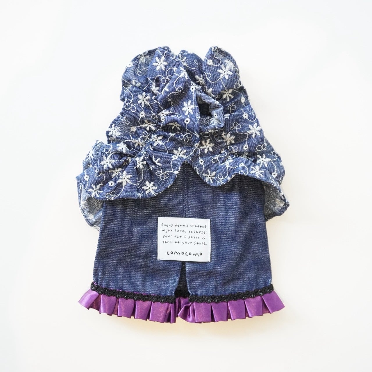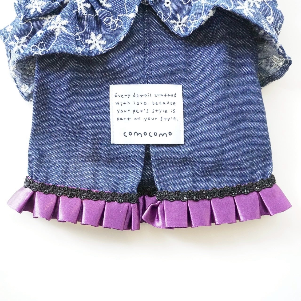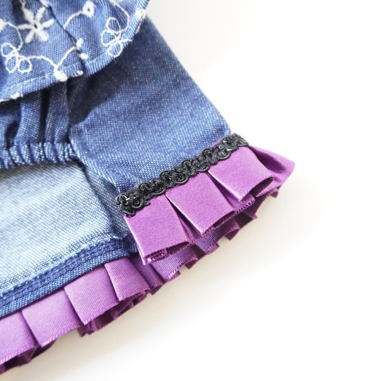 裾部分のパープルカラーのフリルや、背後見頃のブランドタグなど細部までデザインされています。