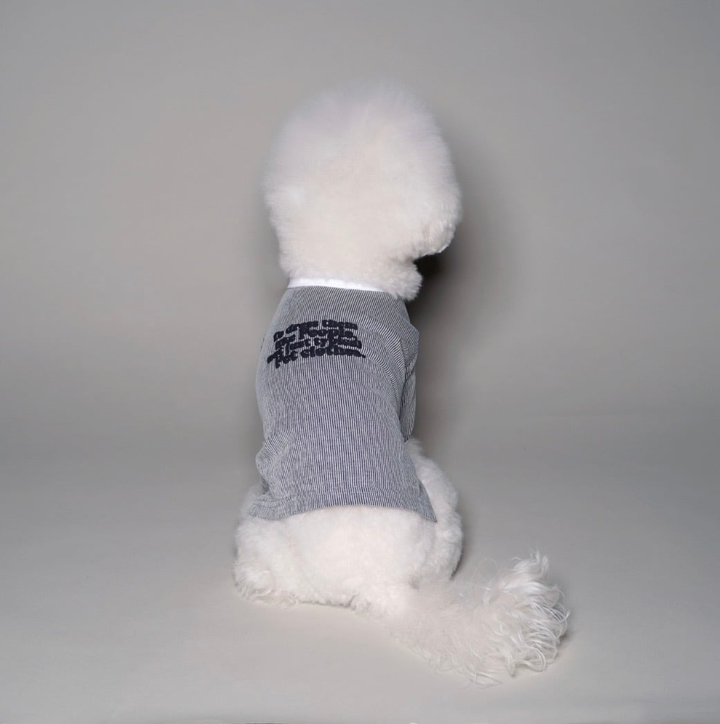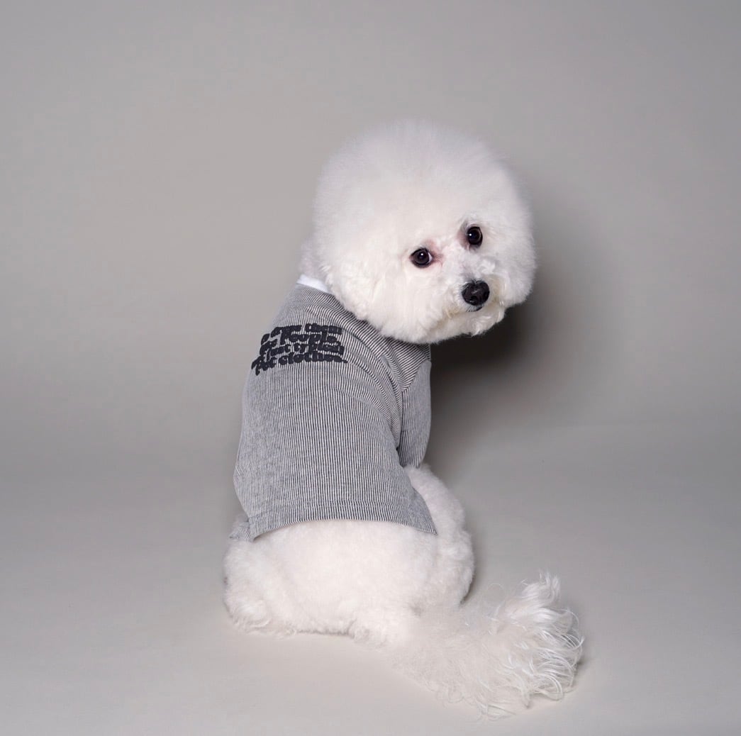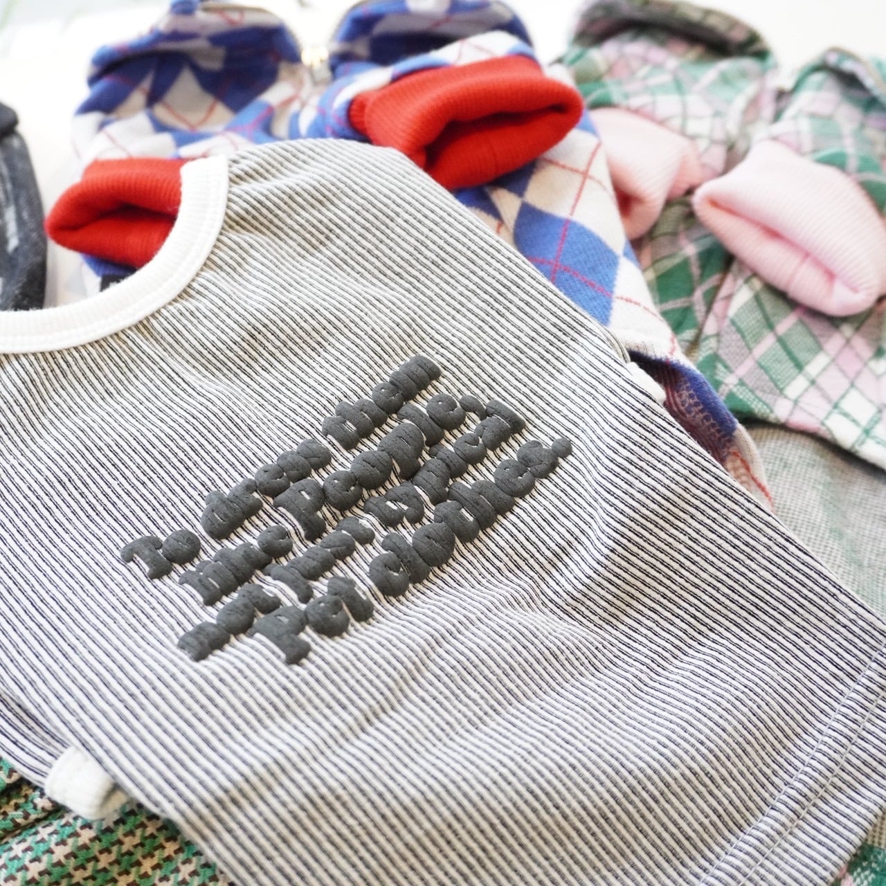 背中には「To dress them like People,not just typical Pet clothes.」(犬の服ではなく、人の服のように着たい)の文章が発泡プリントでデザインされています。