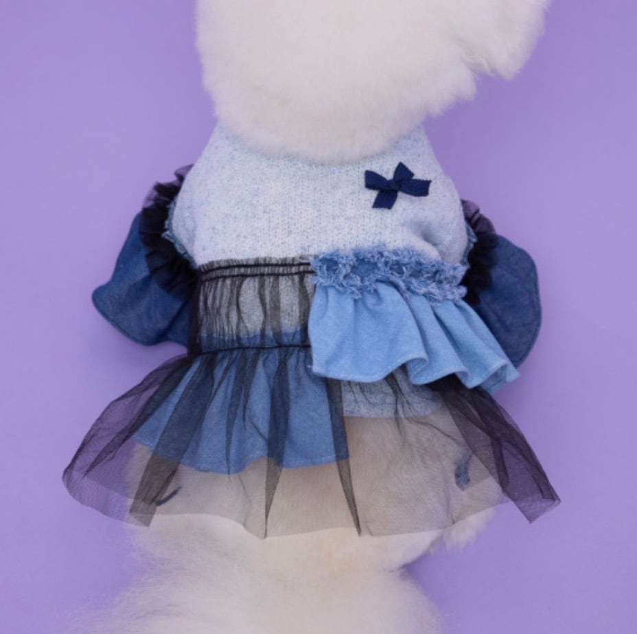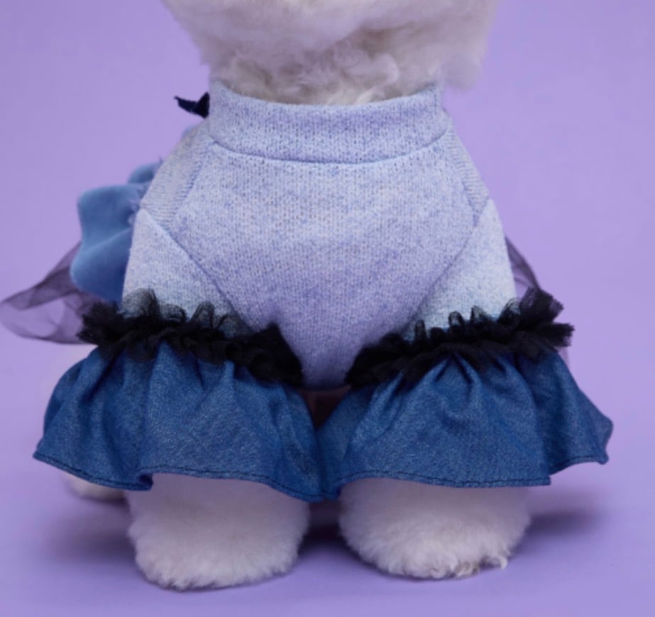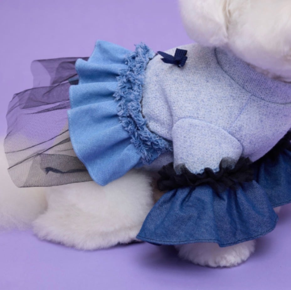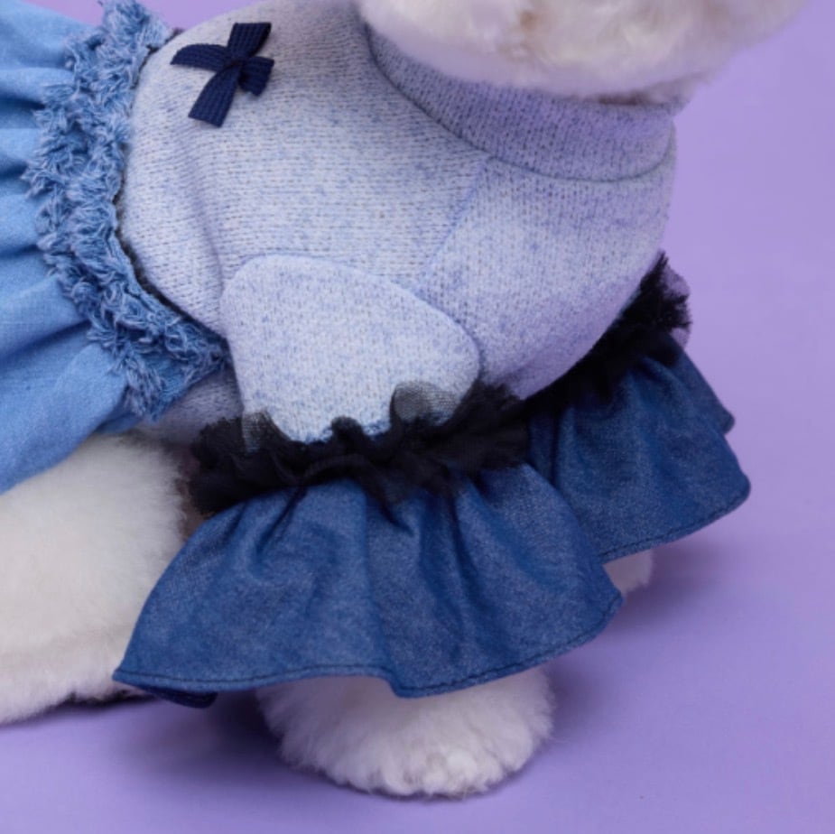 【comocomo】 ポップなカラーリングと細かな装飾品を得意とするブランド。 丈感やシルエットなど、細部にまでデザインされたウェアはパートナーをより可愛くしてくれます。 【DENIM CANDY】 デニムとチュールをアシンメトリーに付いたワンピース。 ボディ部分は綿麻の薄手なニット素材となり春秋にぴったりな素材となります。 伸縮性も高く着脱のしやすさも特徴となっています。 後ろ身頃のリボンが程よいアクセントとなっています。 サイズ表をご確認ください。