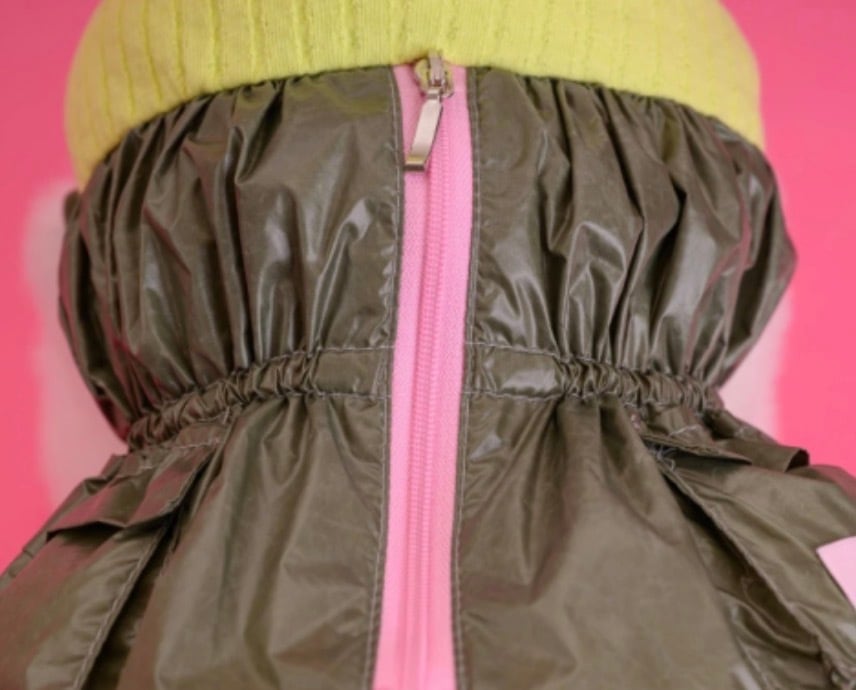 背中見頃のピンクカラーのジップがアクセントとなっております。