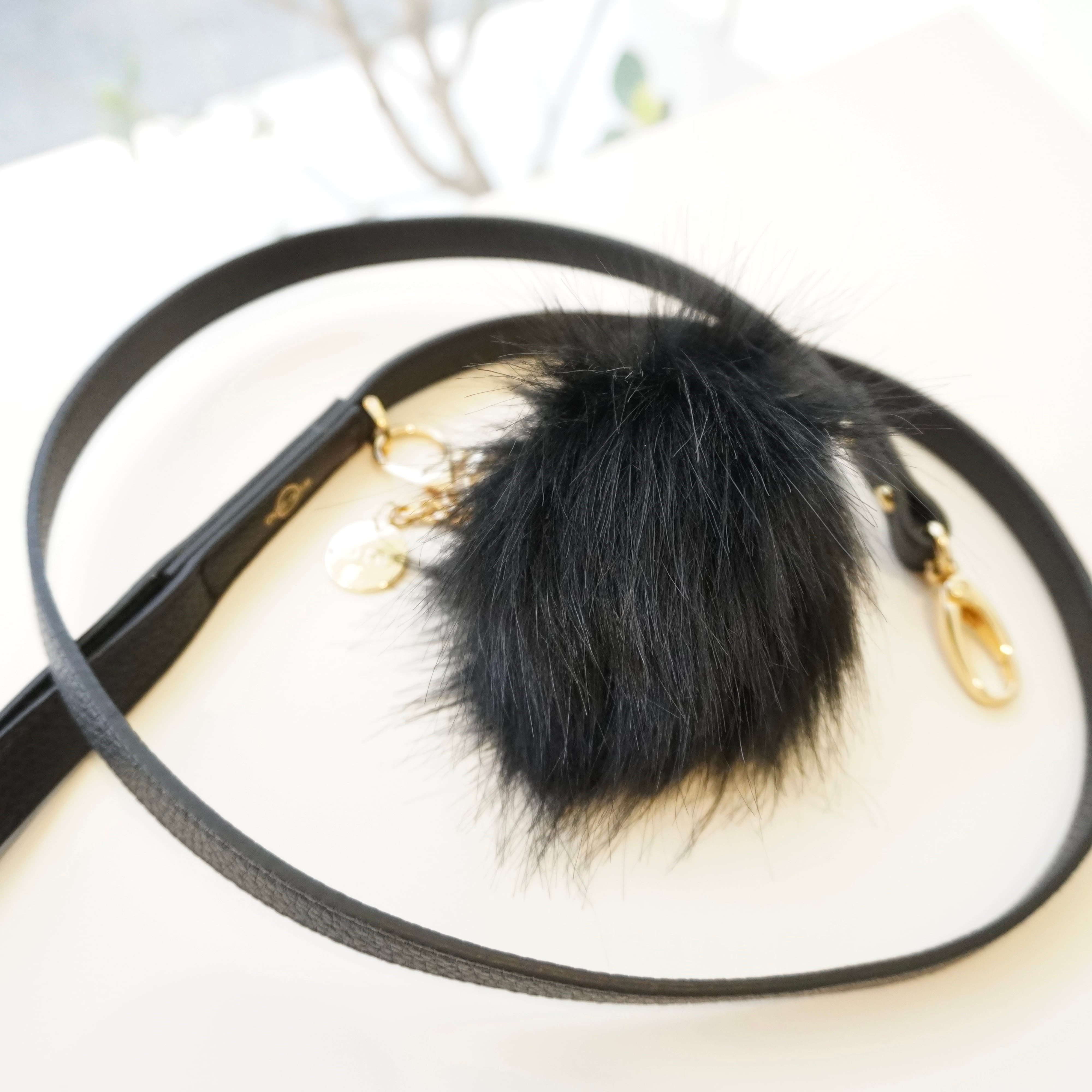 上質なエコファーを使用しており、ゴールドのチェーンとブランドチャームを組み合わせ、高級感のあるデザインに仕上げました。