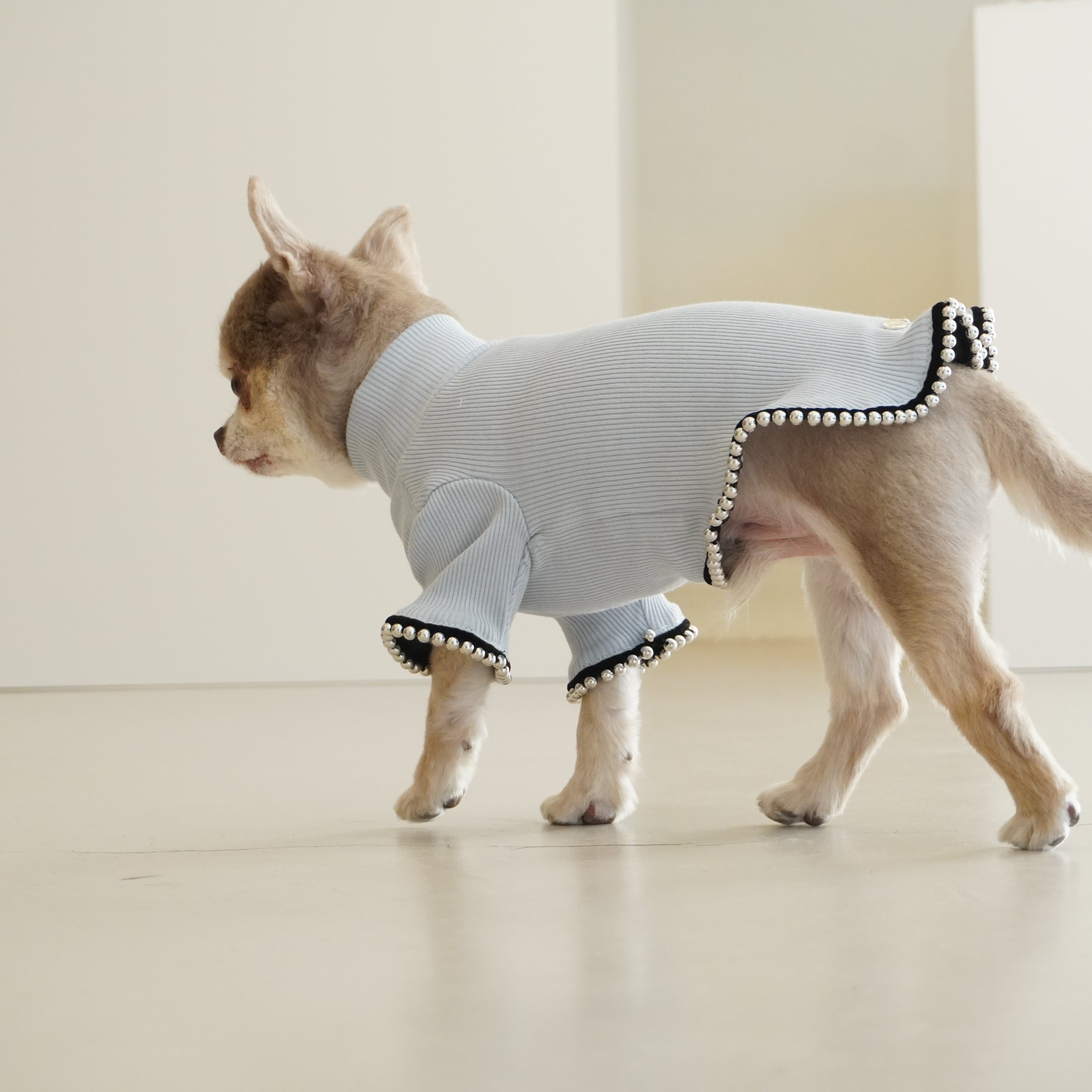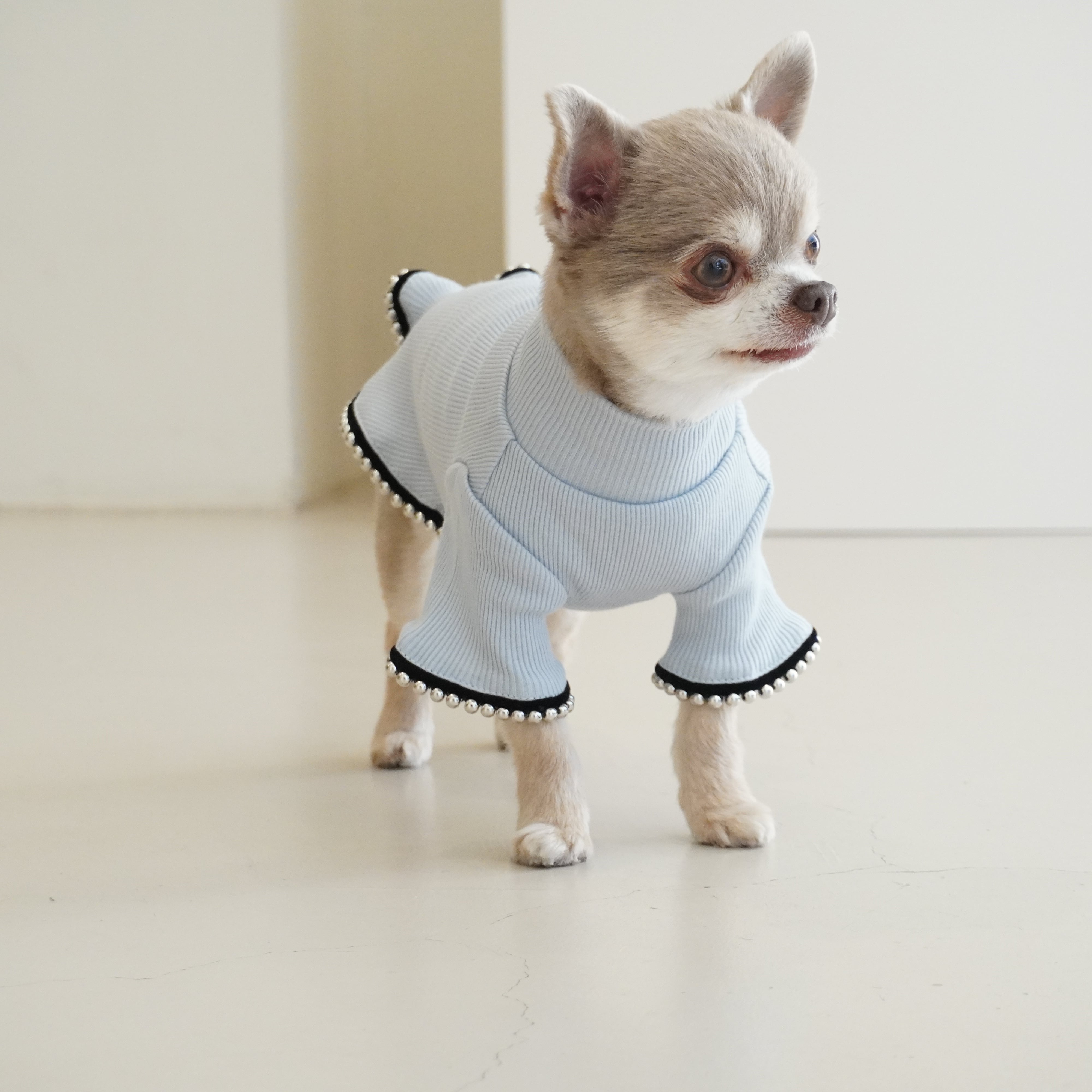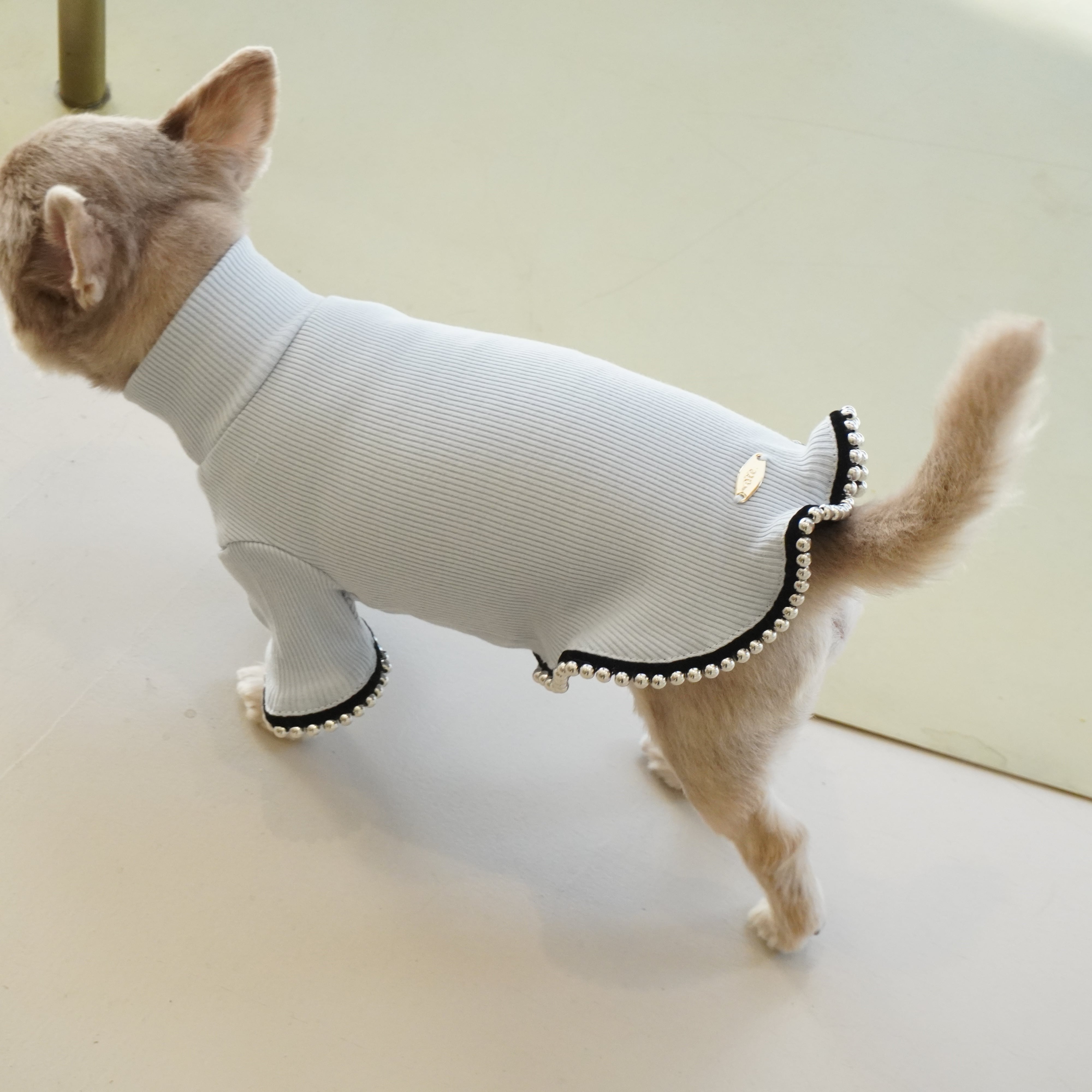 裾口と袖口に波打つようにシルバーボールがラウンドして付けられたカットソー。
