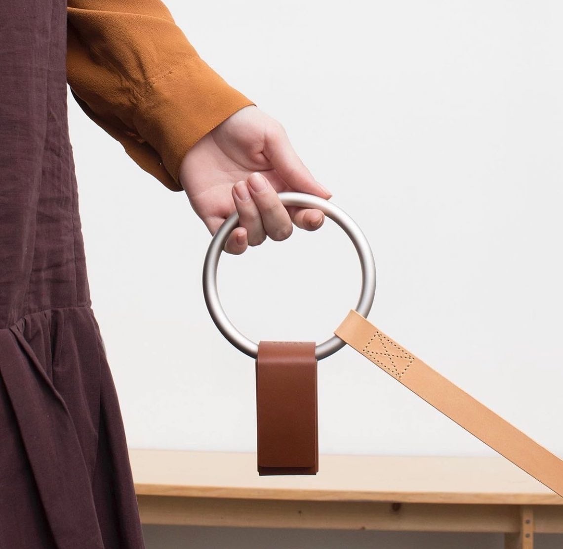 一枚の上質なレザーを独特の幾何学的な形に折り畳んで作られたTotoバッグは、Lumi LeashやRay Harnessに装着できるように設計されています。